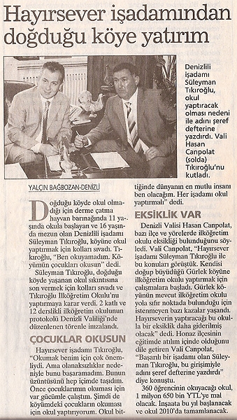 Investment from a philanthropist businessman to the village where he was born: Yeni Asır – 23.04.2008